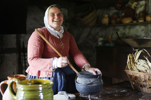Alden will be portrayed by Kathy Rudder, an energetic and entertaining colonial-foodways artisan, and manager of historical crafts, trades, and domestic skills at Plimoth Plantation, in Plymouth, Massachusetts. Rudder’s expertise encompasses the intersection of food in culture, traditions, and history. She will introduce each of the authentic dishes as they are brought out to the rustic, family-style tables, explaining what guests are eating and why. As visitors enjoy their 18th-century desserts, Rudder will share her wit, wisdom, and vast knowledge of all things Thanksgiving, slipping in and out of character, as Priscilla Alden, as needed. She’ll also share some surprising details on the first Thanksgiving, which she describes as a “three-day blow-out” that likely included dancing, singing, military exercises and games. She’ll bring some fascinating extras along, too, including “real” corn bread, made at Plimoth Plantation from an age-old recipe using the sort of dried, colorful Indian corn now considered strictly ornamental. This same corn, Rudder points out, was a staple of the Plymouth Pilgrim diet.