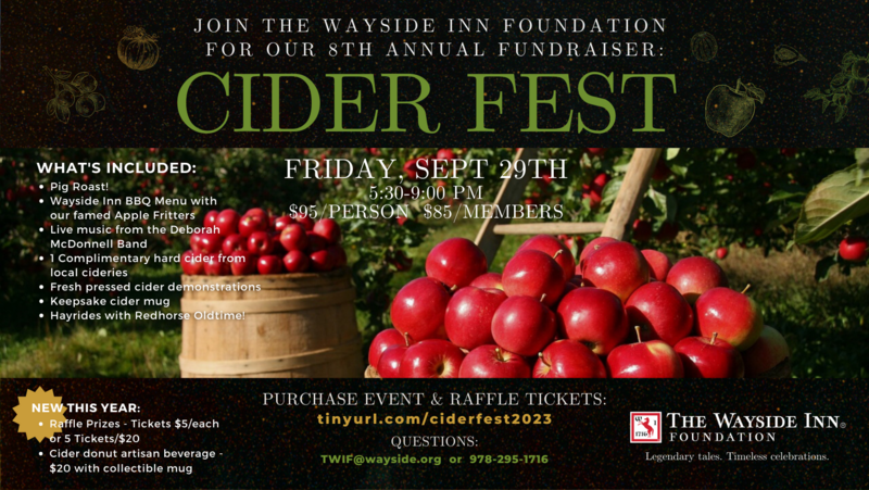 Cost: $95 person / $85 membersIncluded is live music by the Deborah McDonnell Band, pig roast, Wayside Inn BBQ with famed apple fritters, a ticket for 1 hard cider from local cideries, cider demonstrations with fresh pressed apple cider, a cider mug, and the return of the hayride with Red Horse Oldtime. Note: Additional hard craft ciders are $5 each, plus cash bar and assorted soft drinks are also available.New this year: