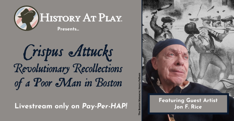 In this livestream episodic series, Pay-Per-HAP invites audiences to explore the mind of an escaped laborer and mariner of late 18th Century Boston. Living Historian Jon F. Rice embodies the vigor of Attucks in a solo presentation, Cripsus Attucks: Revolutionary Recollections of a Poor Man in Boston. Attucks was one of some 3,000 mariners living in Boston; a seaside town of approximately 15,000 people. Like many of his fellow townsmen, Attucks did not enjoy enfranchisment, granted only to white, male, property owners, and was ineligible to vote on the laws that governed his life. If only Attucks were to have survived the American Rebellion, he could share his wisdom! In Revolutionary Recollections, we experience a once-in-a-lifetime opportunity to meet the elder Attucks at an age he never would reach; learning from his incomparable wisdom and enduring spirit!