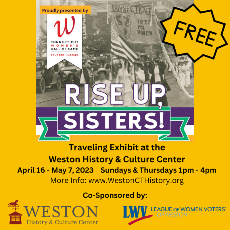 Rise Up, Sisters!, a traveling exhibit from the Connecticut Women’s Hall of Fame, will have a three week engagement at the Weston History & Culture Center in Weston, CT from April 16 – May 7, 2023 and will be open Sundays and Thursdays from 1pm – 4pm. Learn more at: https://westoncthistory.org/item-page.php?id=225&itempageid=1&status=1&pageid=315