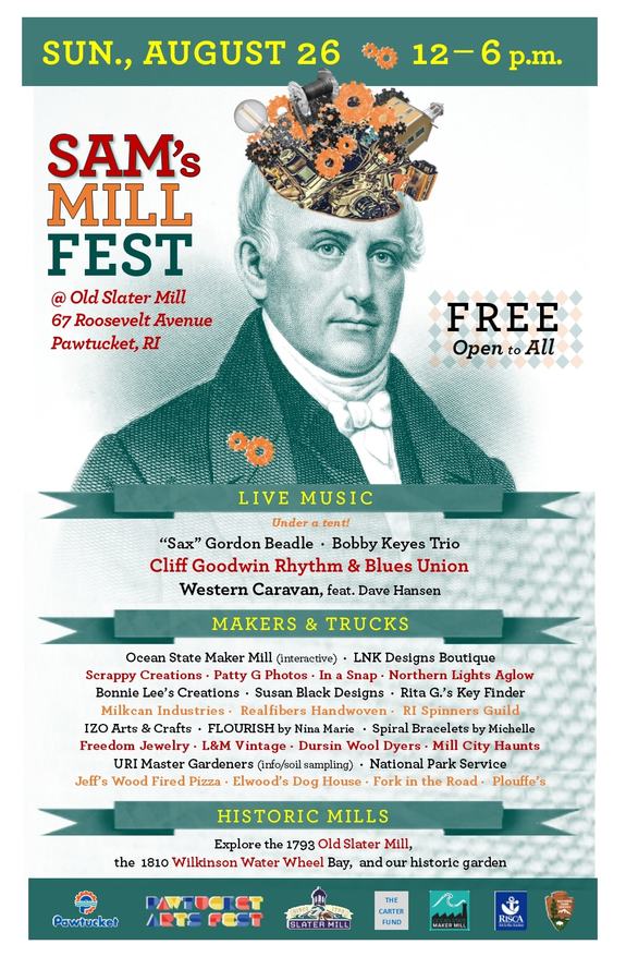 SAM'S MILL FEST is a free outdoor festival of music, artisan enterprise, and industrial history, held at the birthplace of the American Industrial Revolution - Old Slater Mill. SAM's features 25 artisan sellers, food trucks and vendors, free admission to Old Slater Mill museum, and live music under a tent by Sax Gordon Beadle, the Bobby Keyes Trio, Western Caravan featuring Dave Hansen, and the Cliff Goodwin Rhythm & Blues Union.