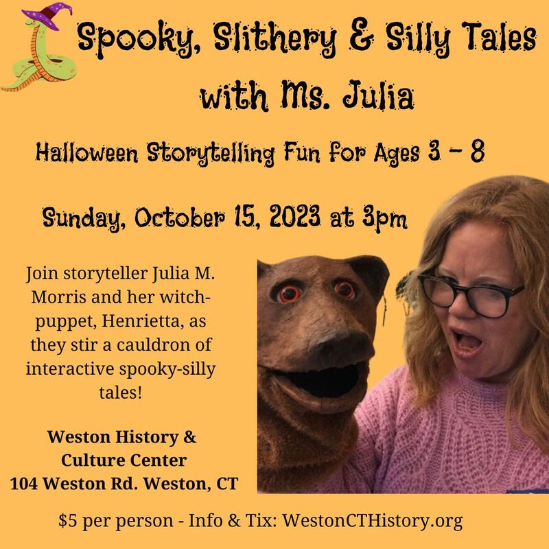 Professional Storyteller Julia M. Morris will be bringing some Halloween fun to the Weston History & Culture Center with her show, “Spooky, Slithery and Silly Tales” on Sunday, October 15, 2023 at 3:00pm. Active and participation-based storytelling for the whole family, geared for children ages 3-8. Tickets are $5.00 per person. Advanced tickets highly recommended. Tickets at: www.WestonCTHistory.org Walk-ins also welcome. This exciting program takes place at the Weston History & Culture Center 104 Weston Road in Weston, CT.