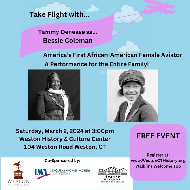 Take flight with Bessie Coleman, America’s first African-American female aviator during this educational and entertaining performance for the entire family! This event takes place on Saturday, March 2, 2023 at 3pm at the Weston History & Culture Center at 104 Weston Road in Weston, CT. Suitable for all ages. FREE event! Register in advance here: https://weston-history--culture-center.ticketleap.com/take-flight-with-bessie-coleman-family-fun-performance/