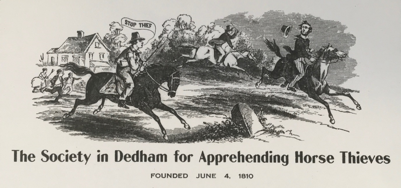 On June 4, 1810, thirteen men met at Marsh’s tavern on Court Street to form The Society in Dedham for Apprehending Horse Thieves. The reason for their meeting and establishing the organization was “the great number of horses stolen from amongst us and in our vicinity.”